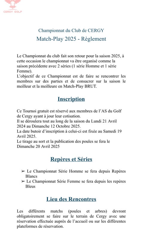 L’As golf du club de Cergy a l’honneur et le plaisir de vous annoncer l’ouverture pour les inscriptions du championnat du club 2025.